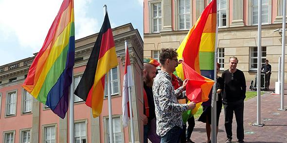 Die Regenbogenfahne wird heute zum zweiten Mal als weltweites Symbol der LSBTIQ*-Community im Innenhof des Landtages gehisst.