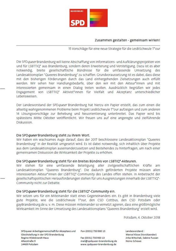 Der Landesvorstand der SPDqueer Brandenburg hat hierzu ein Papier erstellt, das zum einen die allseitig wahrgenommenen Probleme beim Projekt LesBiSchwule T*our aufzeigen und zum anderen 15 Lösungsvorschläge zur Behebung und Neuorientierung unterbreitet. Das Papier wird bis spätestens Mitte Oktober veröffentlicht. Wir freuen uns auf eine angeregte und zielführende Diskussion.